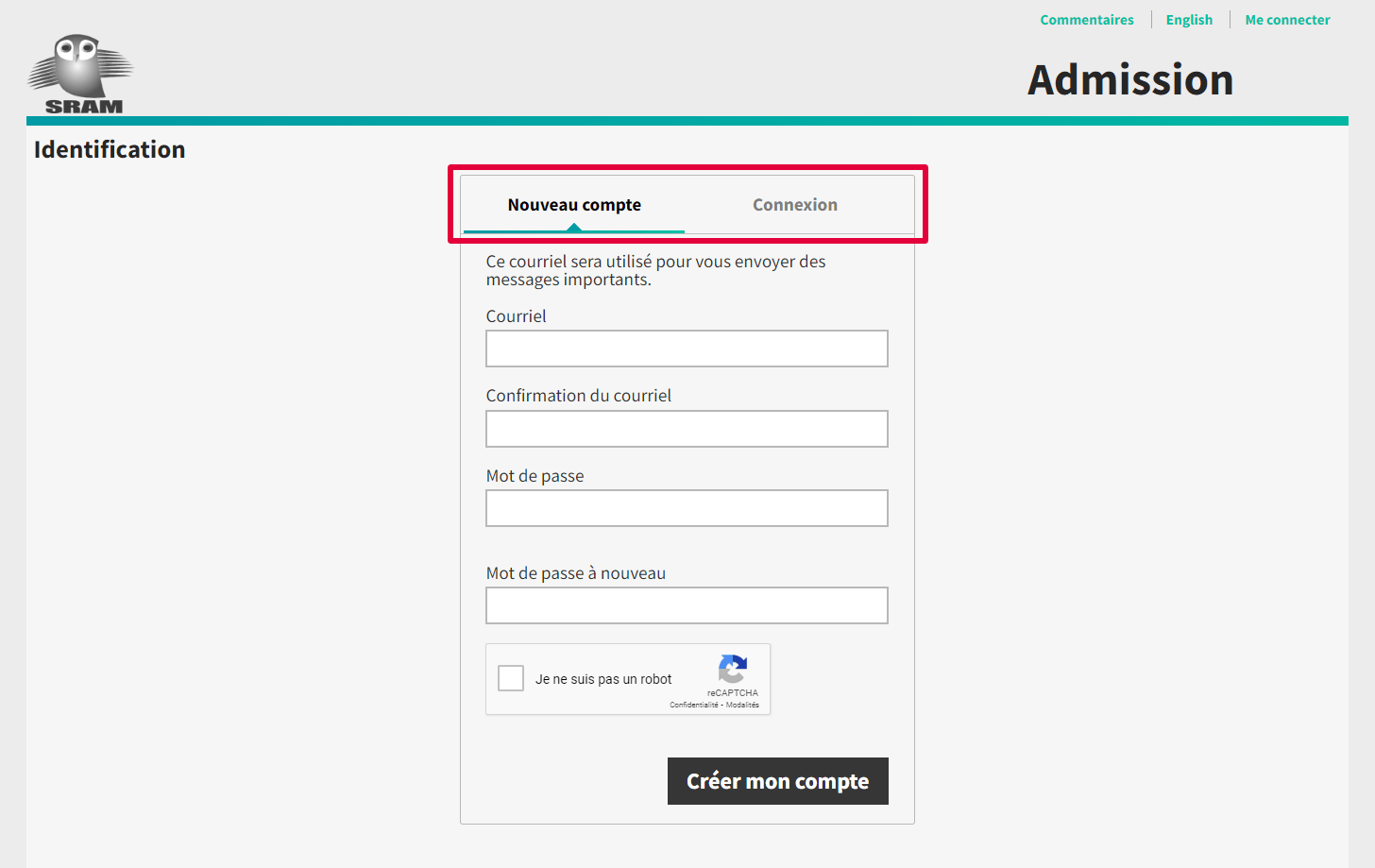 Rendez-vous sur la plateforme d’admission SRAM. Cliquez sur « Faire une demande d’admission« .